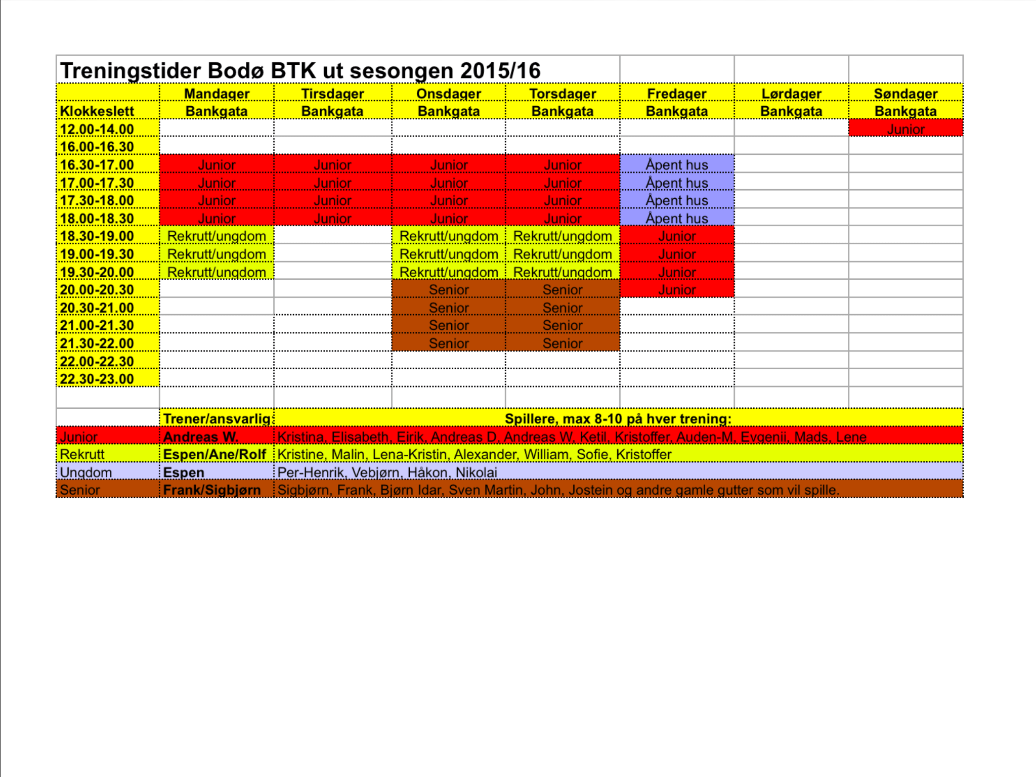 Treningstider for Bodø BTK for sesongen 2015/16 er nå klare, med virkning fra 31. august 2015. Som dere ser vil fleste treningene vil foregå i Bankgata Flerbrukshall, men merk at vi fortsatt kjører noe på Lærerskola. Når det gjelder fredagene så er det mulig det flyttes til Bankgata. Endringer i oppsettet kan komme. Merk dere treningsreglementet som står nederst på siden! Retningslinjer for treninger i Bodø BTK: Møt presis til trening, ferdig skiftet til treningstøy med nødvendig utstyr. Husk drikkeflaske. Om man ikke kan møte til de obligatoriske treningene så gi beskjed pr. SMS til trener minst én time i forveien, skaff deg hans eller hennes nummer så fort som mulig. På Bankgata skjer omkledning i garderobene i 1. etasje. Ta minst mulig med inn i hallen, sko og ytterklær skal være i garderobe og gangen på utsida. Verdisaker og mobiler må man nødvendigvis ha i hallen, men skal ikke være ved bordet. Generelt er det mobil- og nettbrettforbud inne i selve hallen under trening. Gjør alltid ditt beste på treningene og vis alltid respekt for trener og dem man trener med. Treners ord er lov i hallen. På trening er det bordtennis og den aktuelle øvelsen som gjelder og ikke «hva man skal ha til middag eller hva man skal gjøre i helga». Det er generelt snus- og rusmiddelforbud i hallen. Behandle utstyr, hallen og dens inventar med omhu. Alle skal hjelpe til med å rydde opp baller og annet utstyr når treningen er slutt. Knuste baller og annet søppel kastes fortløpende i søppelposer i hallen. Det skal se like bra ut i hallen etter trening som når man startet. Alle baller skal være plukket opp før neste treningsgruppe starter opp. Del dette: Skriv ut(åpnes i en ny fane) Skriv ut Del på Facebook(åpnes i en ny fane) Facebook Send en lenke på e-post til en venn(åpnes i en ny fane) E-post